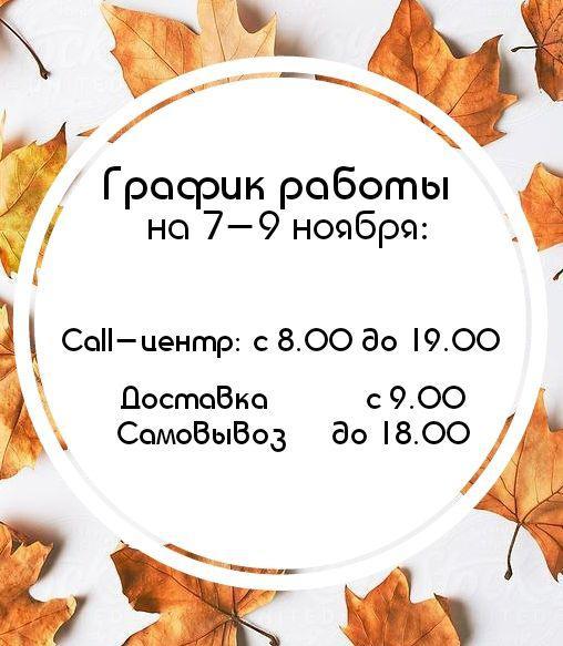 Уважаемые клиенты! Обращаем ваше внимание, что 7 - 9 ноября Call-центр работает с 8:00 до 19:00; Доставка и самовывоз работают с 9:00 до 18:00.Хороших выходных!