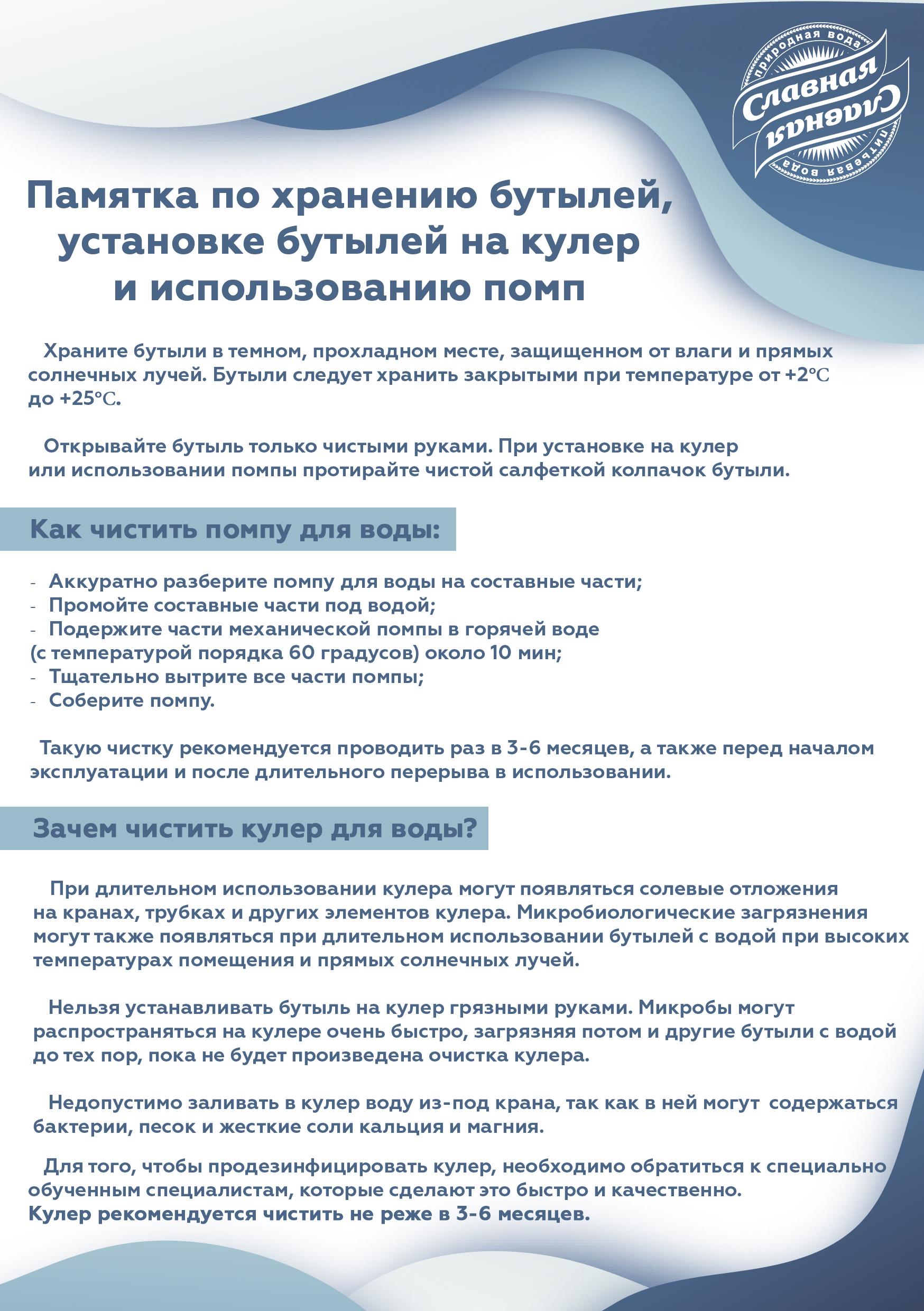 Памятка по установке бутыли на кулер, хранению бутылей и использованию помп