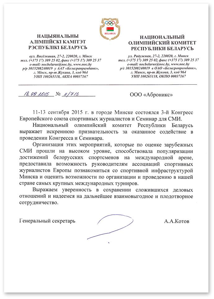 Национальный олимпийский комитет Республики Беларусь в лице генерального секретаря Анатолия Котова выразил свою признательность за оказанное содействие в проведении Конгресса и Семинара: