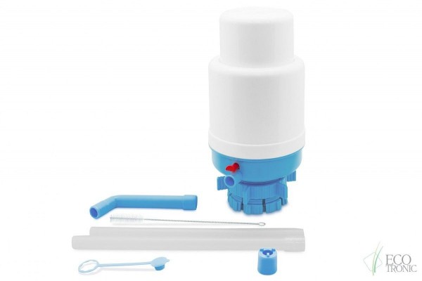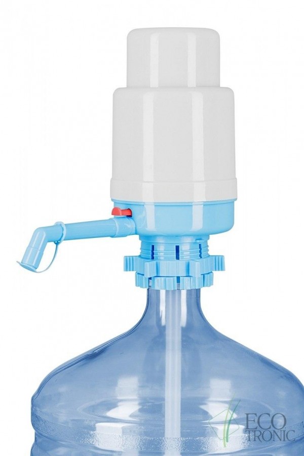 Механическая помпа с кнопкой сброса давления воздуха в бутыли. Удобная модель, предназначенная для бутылей объемом 19 л. Позволяет четко дозировать забор воды в стакан.