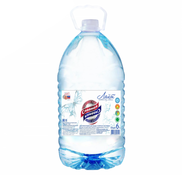 Умягченная питьевая вода "Славная" Лайт теперь в удобном объеме - 6 л! Идеально подходит для приготовления пищи и горячих напитков.